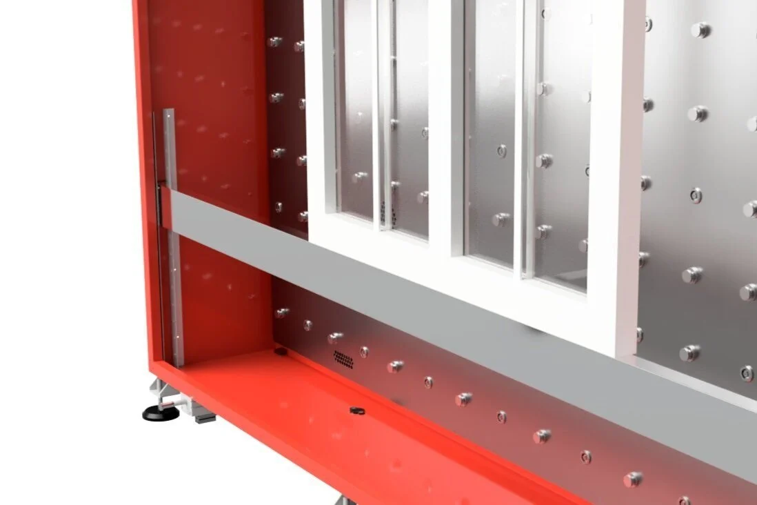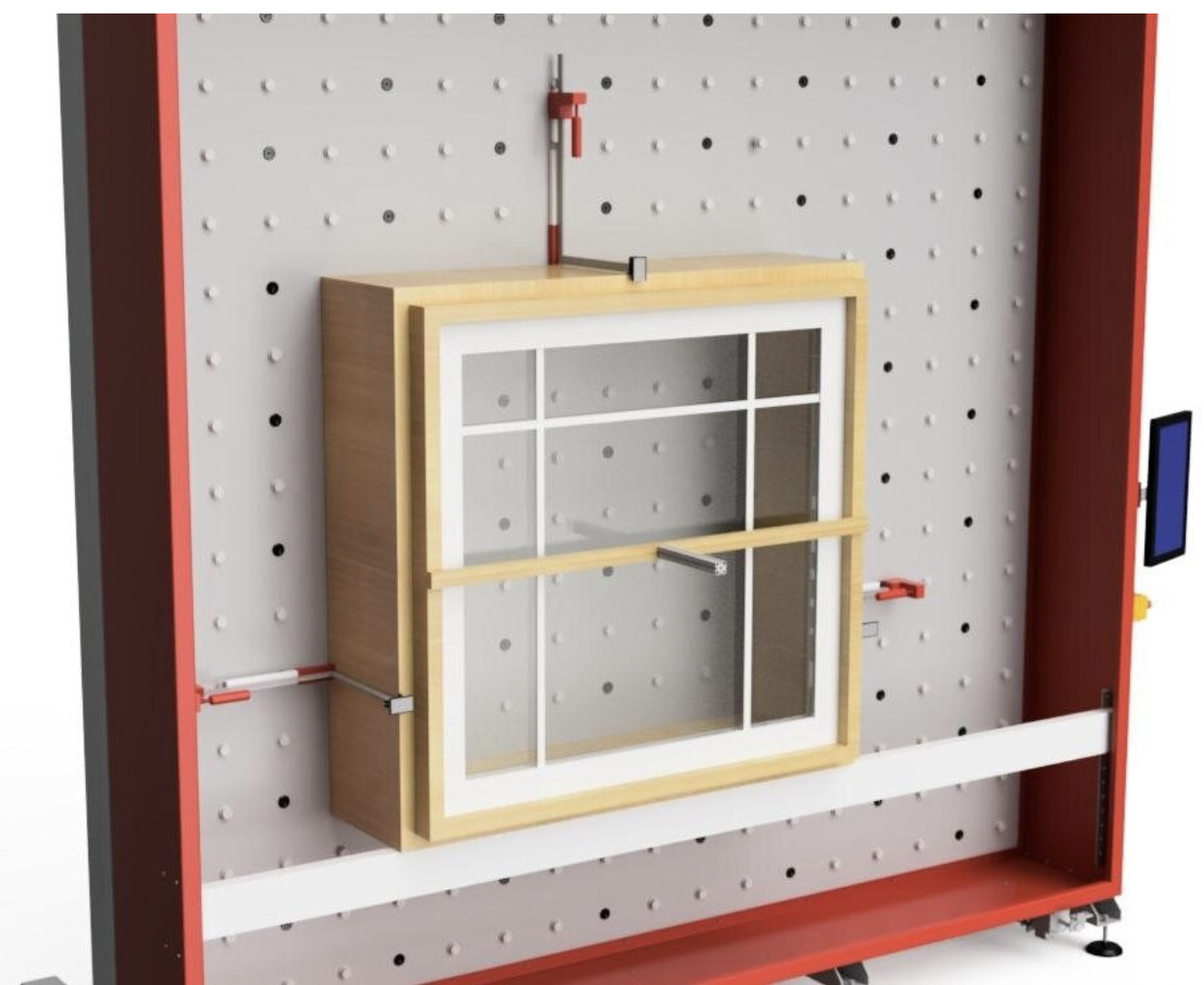 Klemmen zum Sichern des Fensters um die Fenster auszurichten und zu testen. Kann leicht bewegt und über jeder Düse in der gesamten Testwand platziert werden, um jeden Fenstertyp und jede Fenstergröße aufzunehmen.