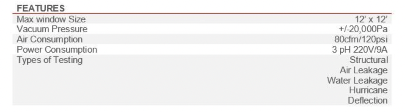Die Software verfolgt und zeichnet Luftstrom, Lufttemperatur, Luftdruck und Wasserdruck auf, um Ihre Fensterleistung zu messen. Dies ermöglicht Tests wie strukturelle Integrität, Durchbiegung, Hurrikan-Simulation, Wasserleckage und Luftleckage.